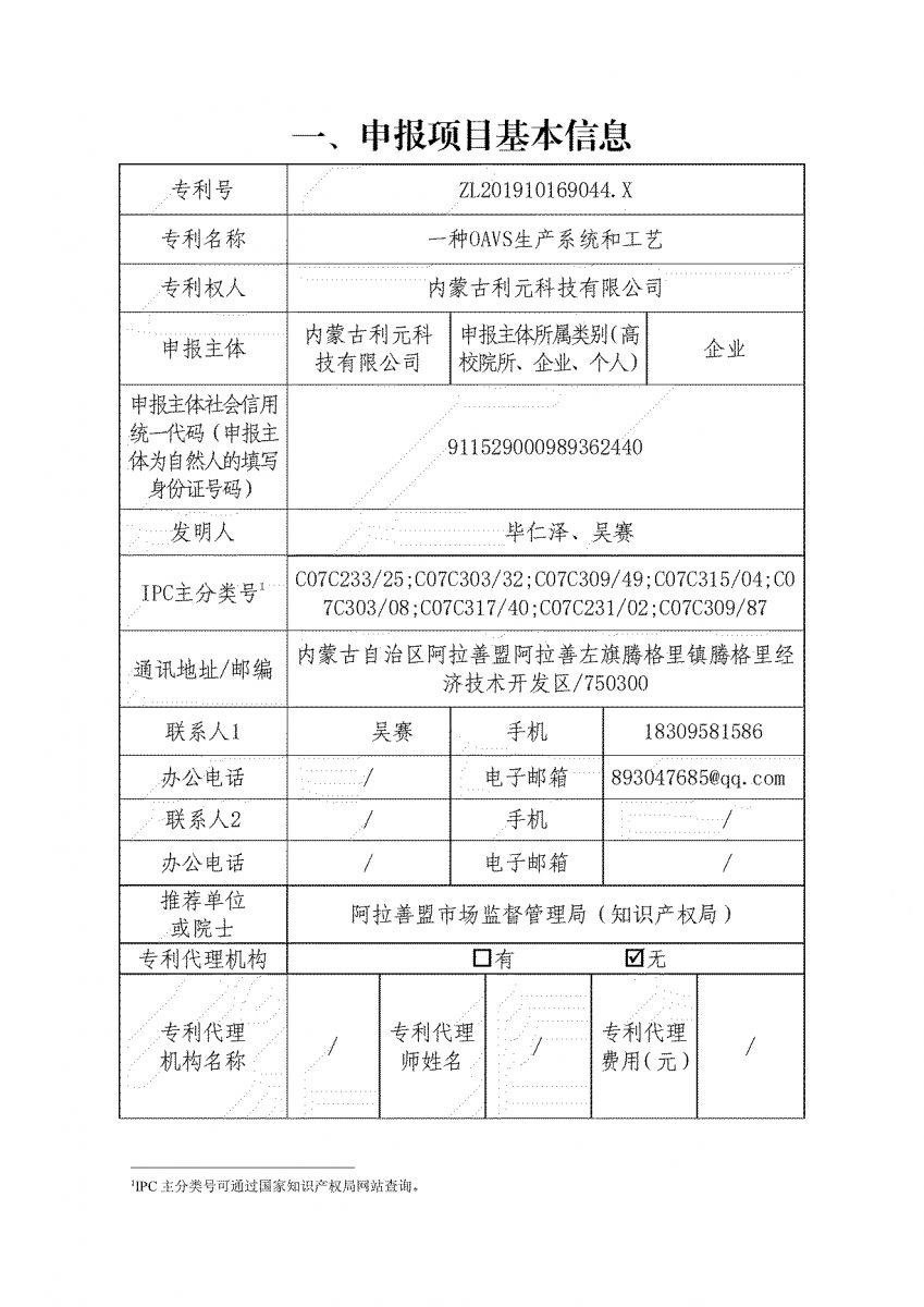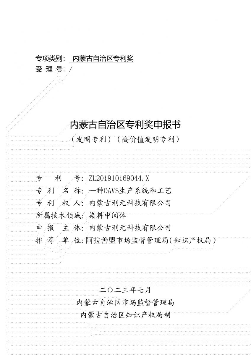 內蒙古自治區(qū)專利獎申請書